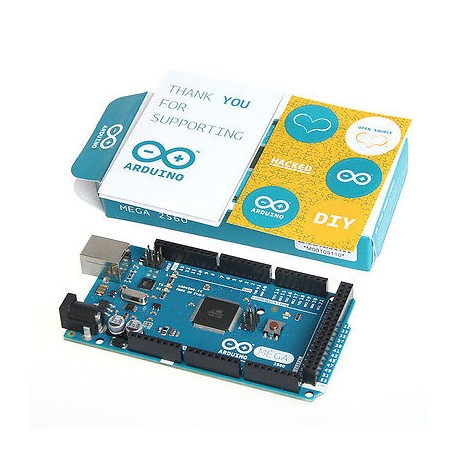 El Arduino Mega está basado en el microcontrolador ATMega2560. Tiene 54 pines de entradas/salidas digitales (14 de las cuales pueden ser utilizadas como salidas PWM), 16 entradas analogas, 4 UARTs (puertos serial por hardware), cristal oscilador de 16 Mhz, conexión USB, jack de alimentación, conector ICSP y botón de reset. Incorpora todo lo necesario para que el microcontrolador trabaje; simplementa conectalo a tu PC por medio de un cable USB o con una fuente de alimentación externa. El Arduino Mega es compatible con la mayoría de los shields diseñados para Arduino Duemilanove, diecimila o UNO.