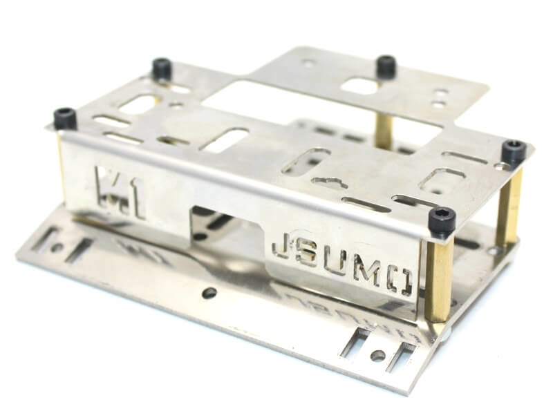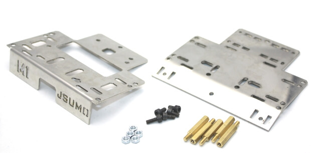 Placa inferior hecha de acero inoxidable de 2 mm y doblada a 20 grados hacia abajo para fijar las cuchillas. La placa superior es perfecta para asegurar sensores y unir placas de control de robot.