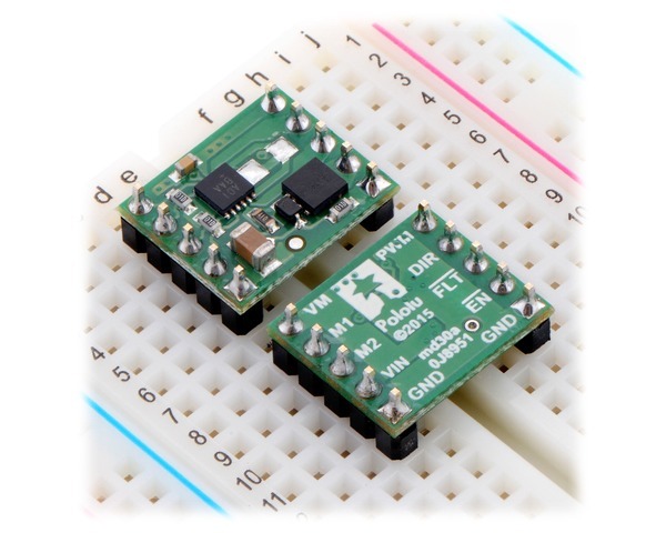 Las conexiones del motor y la alimentación se realizan en un lado de la placa y las conexiones de control en el otro. El controlador requiere que se suministre un voltaje de operación entre 4.5 V y 36 V a la entrada de energía protegida contra inversión, VIN. El pin VM proporciona un acceso conveniente a la tensión de alimentación con protección inversa.