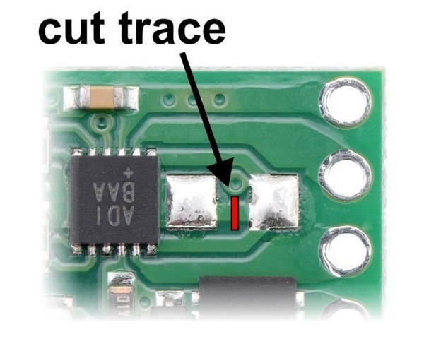 El MAX14870 IC presenta una entrada SNS que se puede usar para la limitación de corriente automática opcional. De manera predeterminada, esta entrada está conectada a tierra en la placa de soporte, que omite la función de regulación actual. Para habilitar la limitación de corriente, primero debe cortar la traza entre las dos almohadillas de resistencia 1206 despobladas en el lado superior de la placa de soporte: