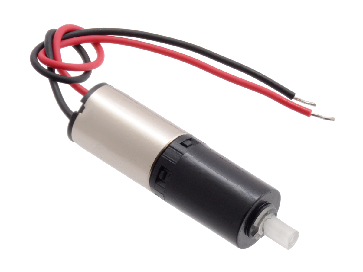 Estos pequeños motorreductores de CC cepillados tienen un diámetro de solo 6 mm y pesan poco más de un gramo, lo que los convierte en excelentes actuadores para robots en miniatura y mecanismos muy pequeños. Consisten en un motor sin núcleo sujeto a una caja de cambios planetaria mediante un pequeño clip. Los engranajes están hechos de polímeros de cristal líquido (LCP) y el eje de salida de nylon de la caja de cambios es compatible con nuestras ruedas de 14 mm . Hay varias relaciones de transmisión disponibles: